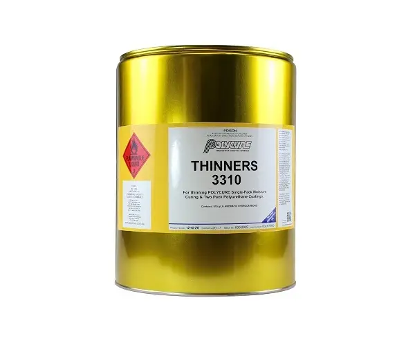 Thinners 3310 has been formulated for use with Polycure’s polyurethane coatings i.e. DURAPOL® Moisture Cure, POLYTHANE® Two Pack Polyurethanes & CRYSTAPOL® Non Yellowing coatings. It is used primarily to enhance the flow characteristics of the polyurethane but can be used under conditions that may be considered abnormal for standard applications (see Data Sheet for further information). It may also be used for cleaning equipment.